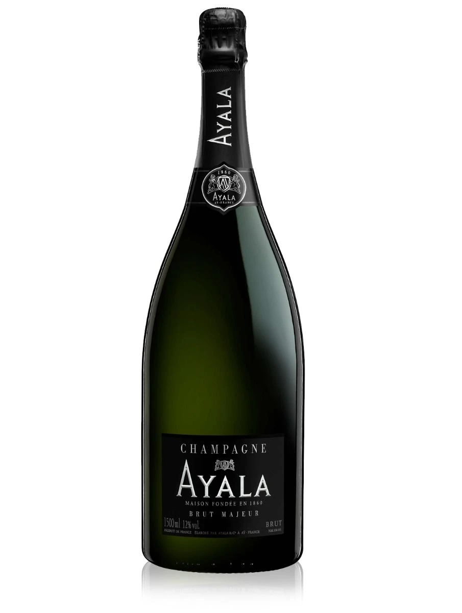 Ayala Champagne’s Brut Majeur Non Vintage Champagne Magnum (150cl) is a blend of Pinot Noir (45%), Chardonnay (30%) and Pinot Meunier grapes, (25%)with a low dosage of 9 grams per litre, this Champagne reveals the delicate nuances of the aromas and the bouquet. Pale gold in colour with a fine mousse, the wine is aromatic on the nose. On the palate, it is well balanced and shows great finesse. Pinot Noir grapes gives the wine richness and a long finish while Chardonnay, from the finest soils of the Côte des Blancs, adds delicacy, liveliness and freshness. Pinot Meunier, mainly from the Marne Valley, gives the wine an appealing fruitiness and roundness. Brut Majeur is the perfect wine to serve throughout a meal.