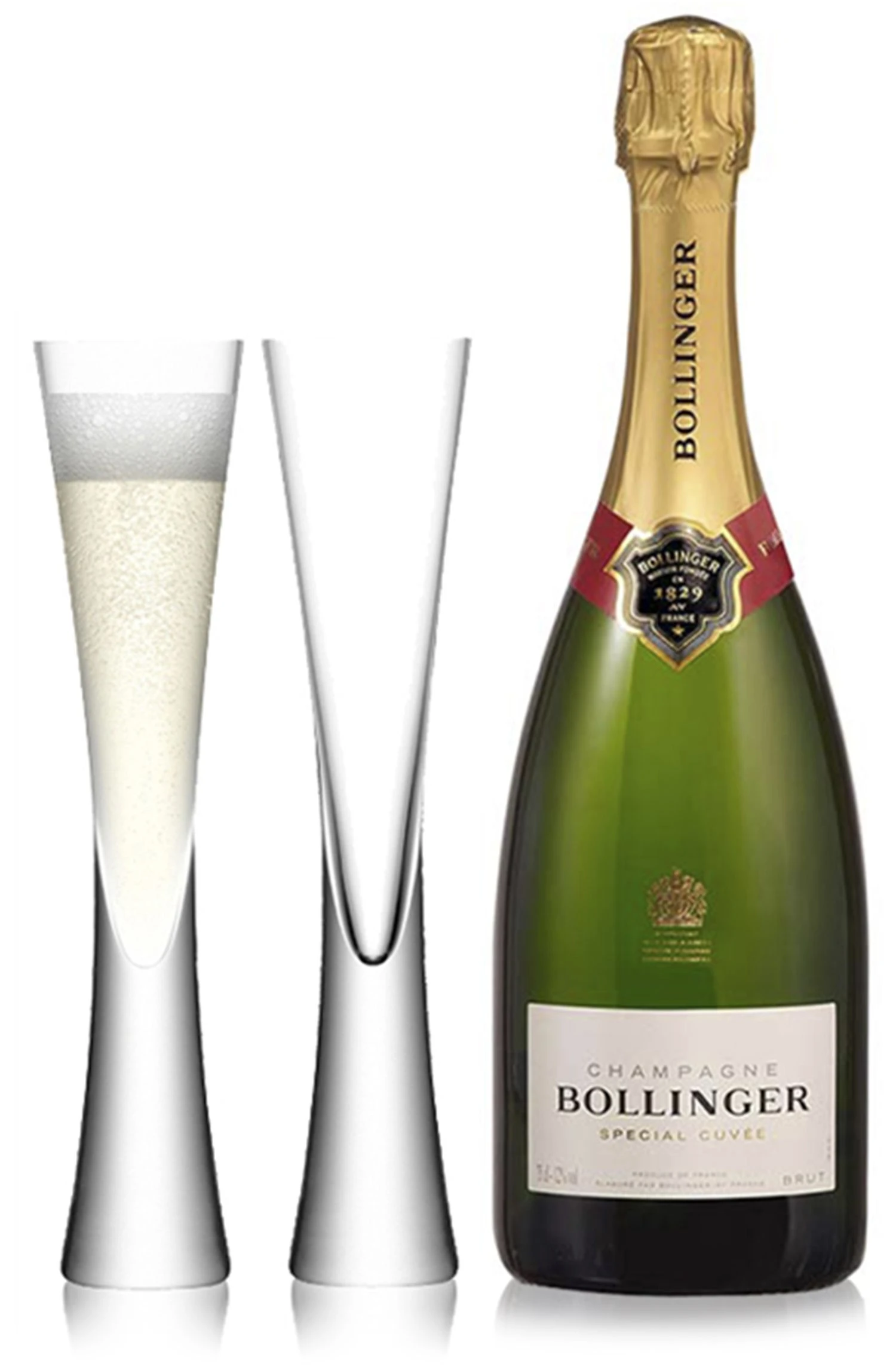 Bollinger Champagne Brut NV Champagne 75cl bottle with two LSA Moya Champagne flutes. It is pale gold in colour, dry with toasty flavours on the mouth, great length and a perfect balance. Complex, bready, toasty, baked apple bouquet with a pleasing dry finish. The Special Cuvée Non vintage Champagne contains the full expression of the Bollinger style and the House feels it should be judged on this – its benchmark wine. Moya flutes come as a pair and are hand made mouth blown glasses made by LSA International designer glassware. Presented in a LSA branded box.