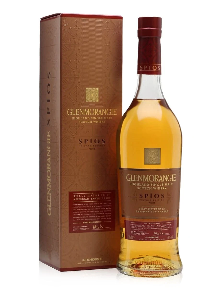 Glenmorangie Spios Single Malt Whisky is the first single malt whisky to be aged exclusively in ex-rye American oak barrels. Its name, Spios, is Gaelic for spice, and hints to the flavour profile of this whisky. It bursts with aromas of spices like clove, cinnamon, anise and vanilla. There are also classic Glenmorangie notes of cherry, plum, sweet apple and nutty toffee.