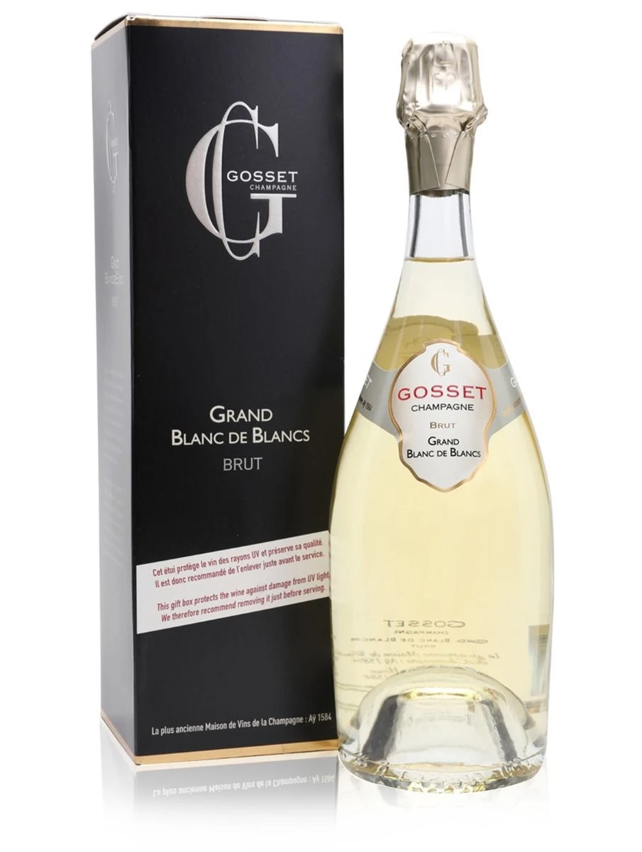 Gosset Grand Blanc de Blancs Champagne is crisp, fresh and 100% Chardonnay grapes and cellared for up to 4 years. Golden yellow with delicate green tints typical of the great Blanc de Blancs. Very fine bubbles. It is both mineral and floral with aromas of flowers and white fruits, apricot and Mirabelle plum. Very light notes of lemon, citrus fruits, crystallized quince and honey. Harmonious, complex and delicate with a great freshness. A crisp and well-structured champagne with a gentle silky finish.