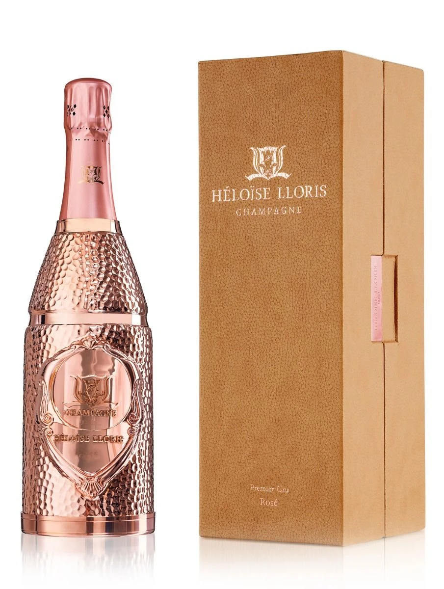 Héloïse-Lloris Premier Cru Rosé Champagne is finished in 18k Rose Gold handmade in England to prevent light and temperature damage to the wine, mirroring cellar conditions. This champagne holds beautiful light salmon colours, showing the perfect blend of chardonnay, pinot noir and red wine from meunier.