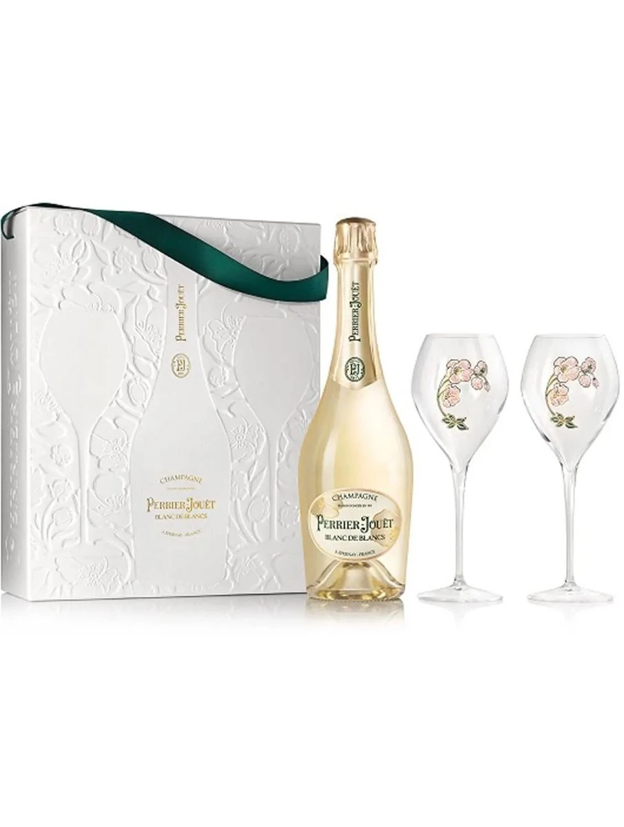 Perrier-Jouet Blanc de Blancs Champagne 2 Flute Gift Set is presented in a stunning branded Gift Box with two delicately designed Perrier Jouet glasses with the world-famous anemone design. the result of a carefully selected and elegant blend of floral Chardonnays.