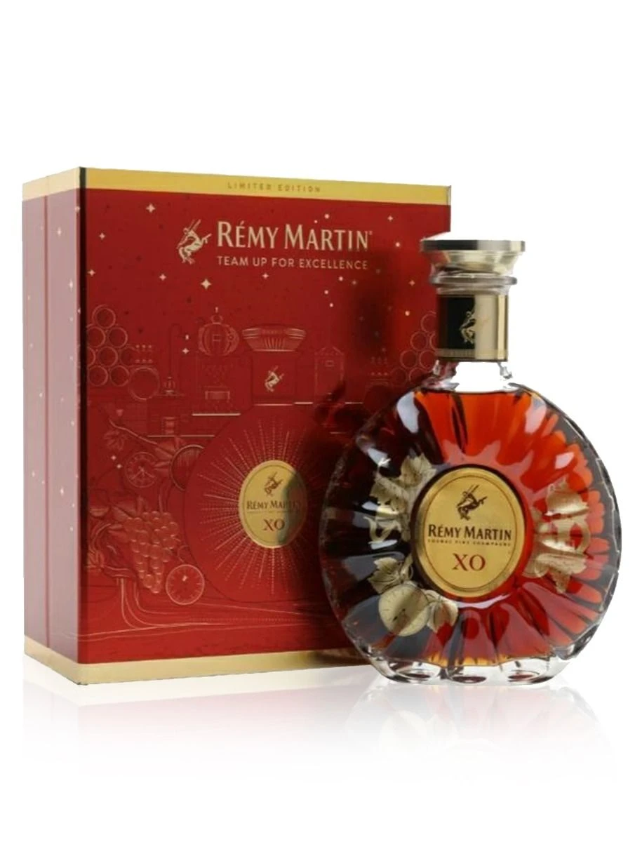 Remy Martin XO fine champagne cognac presented in a red and gold Christmas 2020 limited edition box, as shown in the image.